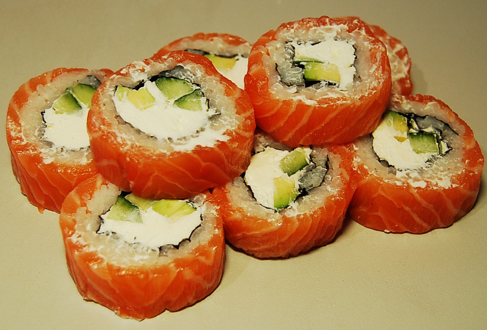 Сегодня набрало популярности в нашей стране такое традиционное блюдо Японии, как суши и сейчас в японских ресторанах готовят данного блюда достаточно много видов. Чтобы приготовить суши, нужны некоторые малознакомые нам экзотические ингредиенты, однако их можно приобрести в магазинах, реализующих различные восточные специи, а также гипермаркетах. Однако в настоящее время данное блюдо можно заказать, существует много фирм в любом практически городе, которые реализуют желающим суши с доставкой на дом, к примеру, в Перми. Если вы все же решились приготовить суши дома, то воспользуйтесь некоторыми советами указанными, ниже, как правильно это сделать. Ингредиенты: - бамбуковый коврик; - 100 грамм семги малосоленой; - 100 грамм риса; - по 1 штуке авокадо и свежий огурец; - 1 чайная ложка сахара; - 1 лист нори; - 3 столовые ложки уксуса (рисового); - васаби, соль и соевый соус по вкусу; Способ приготовления: Для приготовления риса вам нужен круглый рис, который нужно промывать до тех пор, пока вода не станет прозрачной. После переложите его в небольшую кастрюлю, залейте водой (на 1 чашку риса нужно взять две чашки воды). Поставьте емкость с рисом на сильный огонь и постепенно доведите его до кипения, затем убавьте огонь до минимума и варите под крышкой на протяжении 12 минут. После кастрюлю с рисом уберите с огня и еще оставьте на 15 минут. Чтобы заправить рис, смешайте отдельно в емкости 1 ложку (столовую) рисового уксуса, соли и сахара, залейте такой заправкой рис и довольно тщательно перемешайте. Оставшийся рисовый уксус разведите немного в кипяченой воде, чтобы смачивать руки, а также нож, которым будут нарезаться суши. Авокадо с огурцом нарежьте вдоль и кусочками, а семгу на тоненькие полоски. Лист нори уложите на бамбуковый коврик, обязательно гладкой стороной. На другую сторону выложите равномерно рис в один слой, распределяя его руками, прежде смоченными в воде с уксусом. На средину листа, на рис, нанесите васаби тоненькой полоской, рядом с которым выложите одну полоску семги, так же полоску авокадо и огурца. Используя бамбуковый коврик, осторожно сверните рулетом суши, уплотняя. Затем нарежьте суши, пользуясь ножом, непосредственно, перед тем как резать, смочите его в воде с уксусом. К суши подайте соевый соус. |